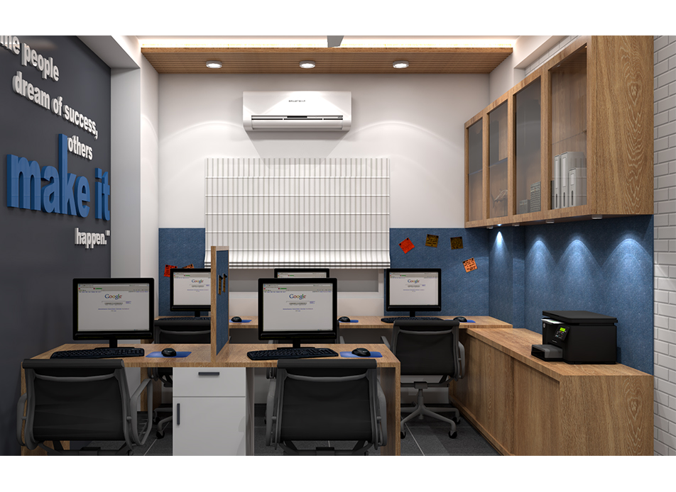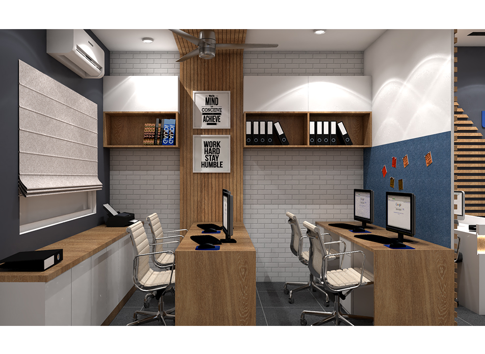 This small 400 sft office was renovated to cater to new space needs and to give it a fresh and open look. A lot of glass was used to make the office look larger and storage units were planned to take care of storage issues. A small cabin was planned for the manager and separate areas for various departments were carved out. The look feel is very light, airy and contemporary.