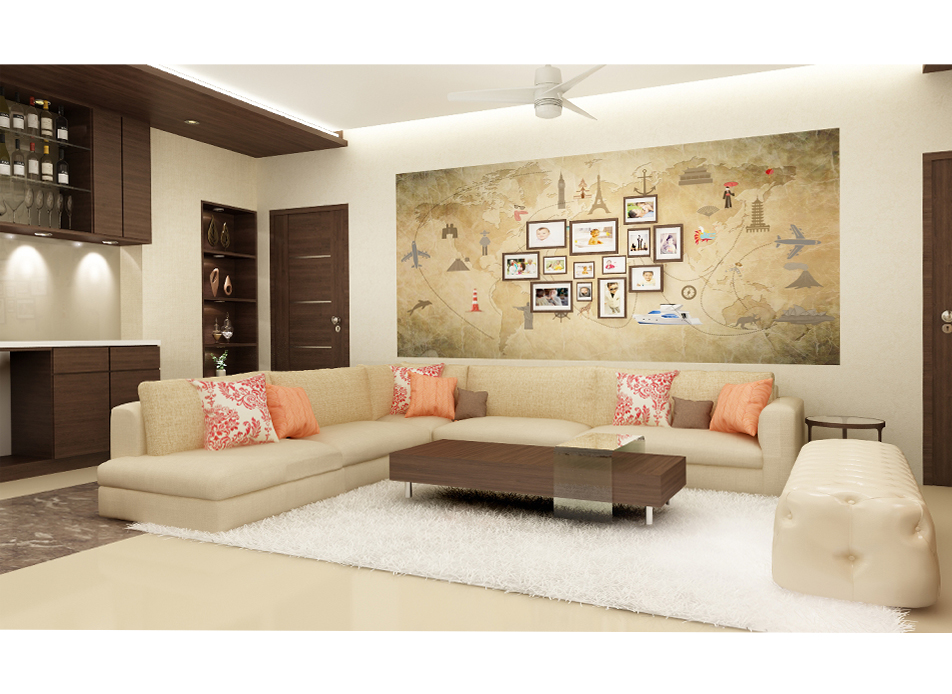 This apartment belongs to a well travelled couple and they wanted to display their love for travel around the world. The apartment had two living areas, one formal and another informal which they turned into a media room. The formal living has a custom made feature wall which has a world map with their travel pictures spread across it.