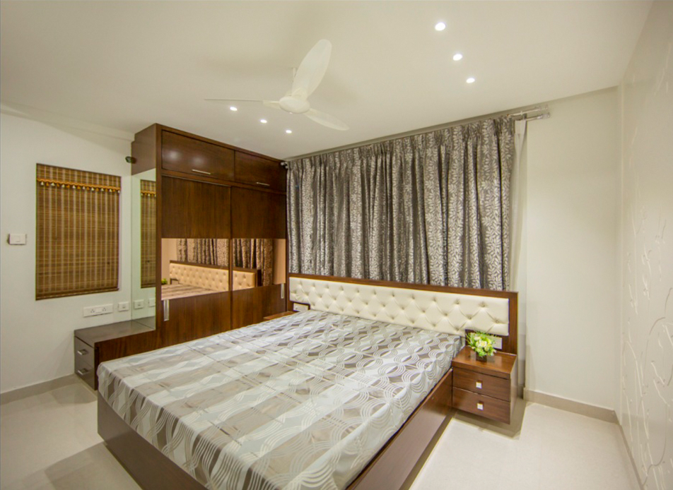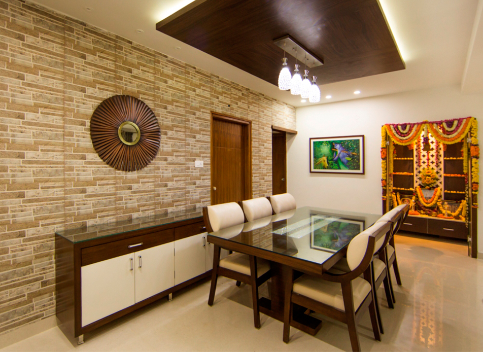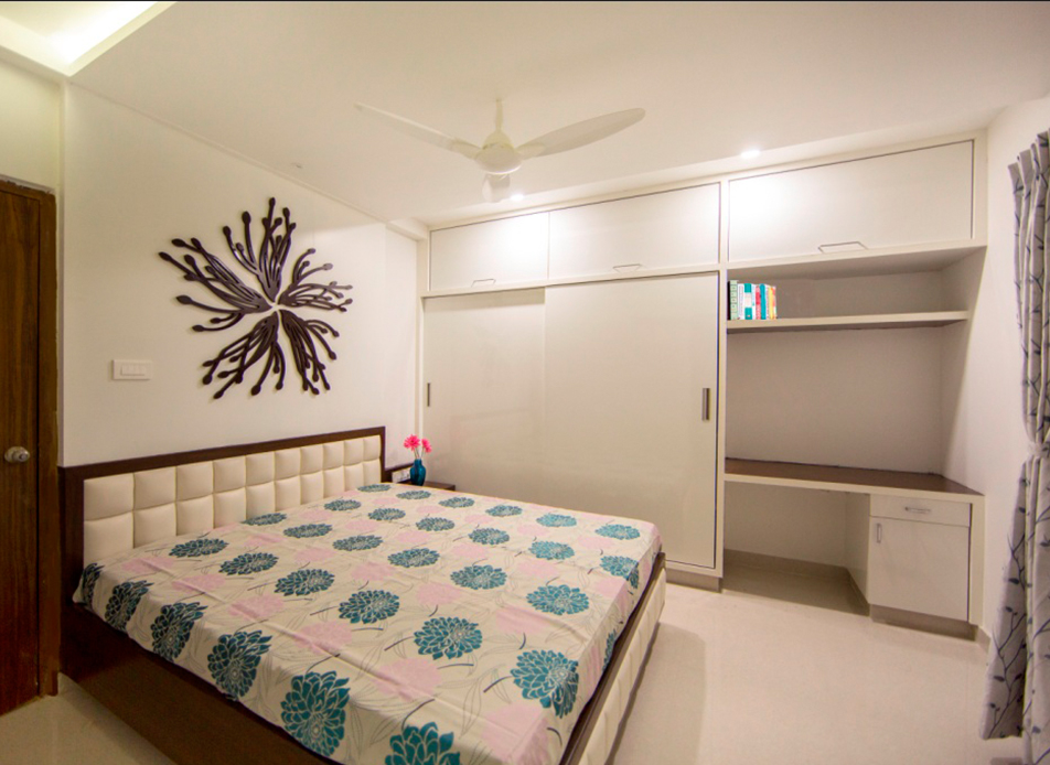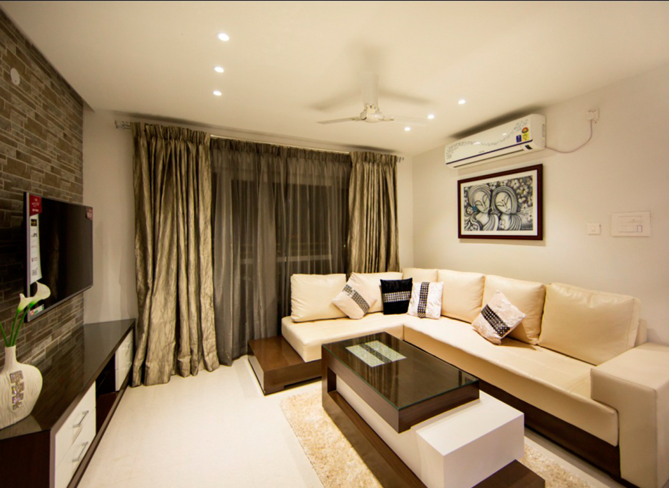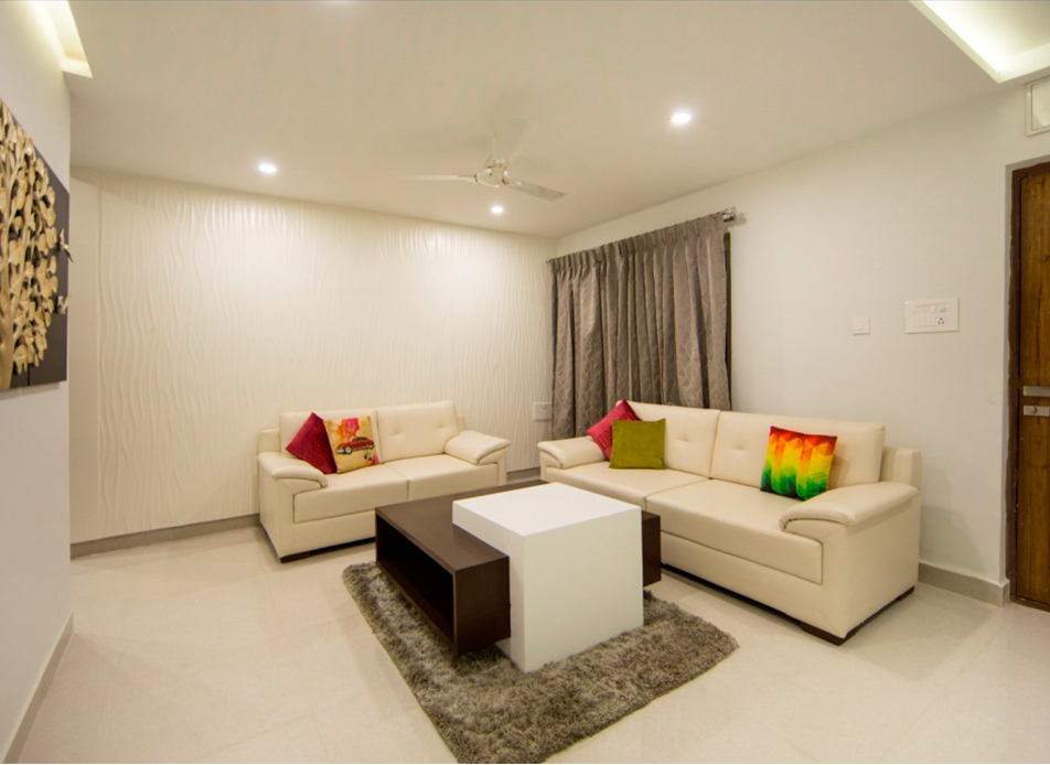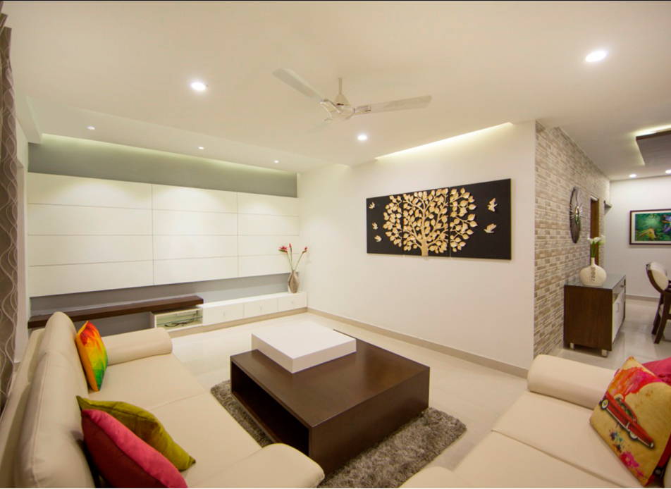 It was designed keeping these points in mind. The monotony of white is broken by wood tones and neutral coloured fabrics. Carefully positioned lighting and art enhances the beauty of the apartment